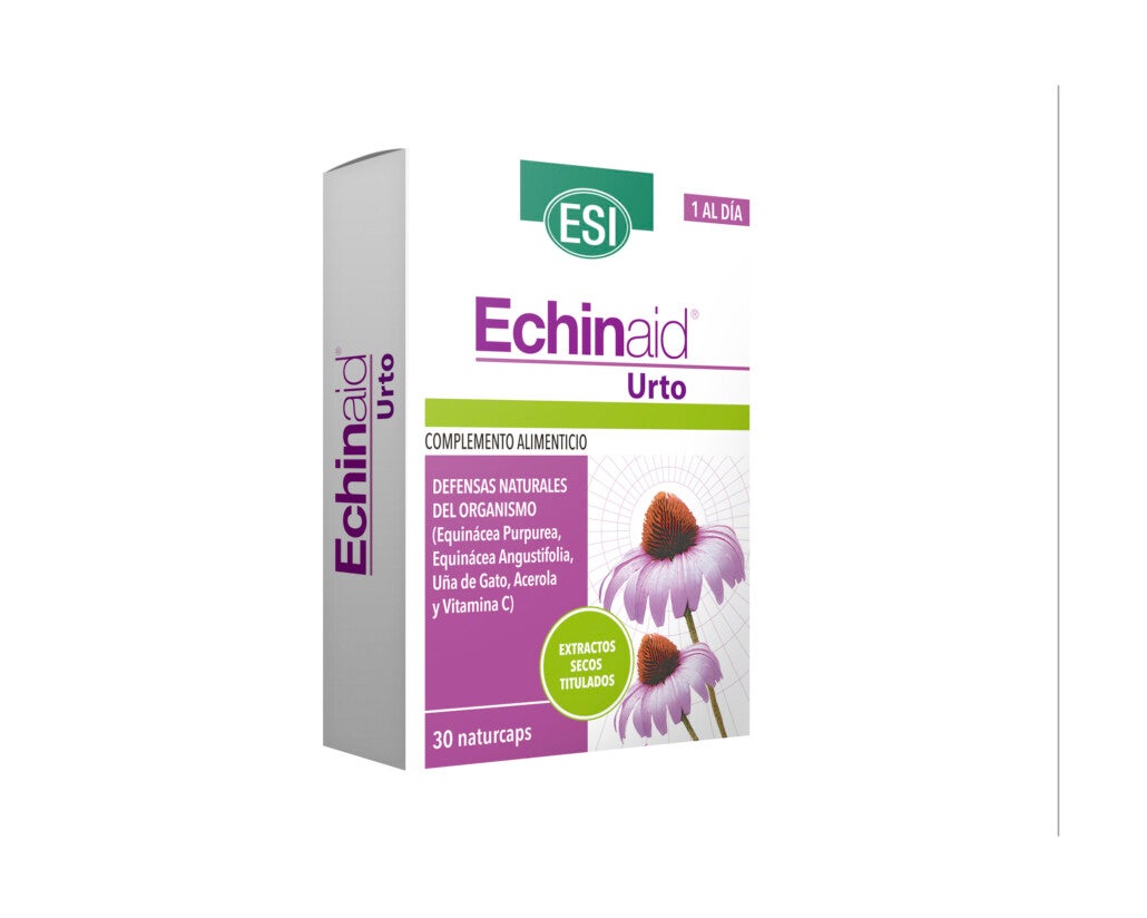Echinaid Urto es un complemento alimenticio con extractos titulados de Echinacea Purpurea, Echinacea Angustifolia, Uncaria Tomentosa, Acerola, Rosa Mosqueta y Vitamina e para proteger el organismo. Naturcaps: constituida por una fibra vegetal completamente natural, obtenida de la fermentación de la tapioca; no lleva colorantes artificiales, se digiere fácilmente y es adecuada para veganos y vegetarianos.